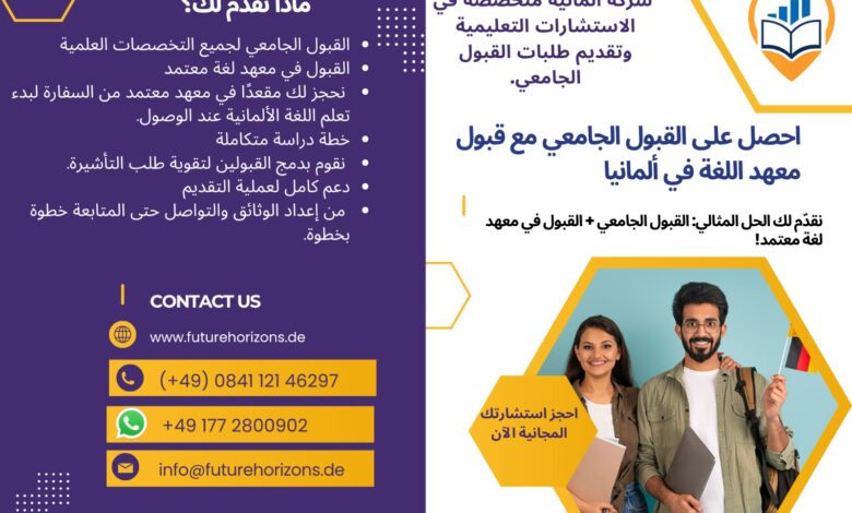في ظل الإقبال المتزايد من الطلاب العرب على الدراسة في ألمانيا، تبرز الحاجة إلى خدمات استشارية تعليمية موثوقة تضمن للطالب بداية أكاديمية قوية ومضمونة. وهنا تأتي شركة Future Horizons – الشركة الألمانية المتخصصة في الاستشارات التعليمية وتقديم طلبات القبول الجامعي.