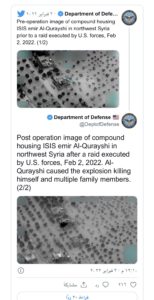 ونشر البنتاغون على “تويتر” الصورة الأولى، قائلا إنها “الصورة ما قبل العملية للمجمع الذي كان يستضيف أمير “داعش” القرشي بشمال غربي سوريا قبل العملية التي نفذتها القوات الأمريكية يوم 2 فبراير 2022″.