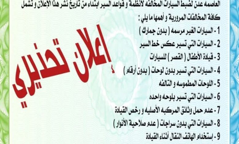 و عليه فإن شرطة السير م / عدن تؤكد عدم التهاون مع كل من يخالف ما جاء في نص هذا الإعلان و سوف يتم إتخاذ الإجراءات القانونية ضده….. و الله ولي التوفيق.