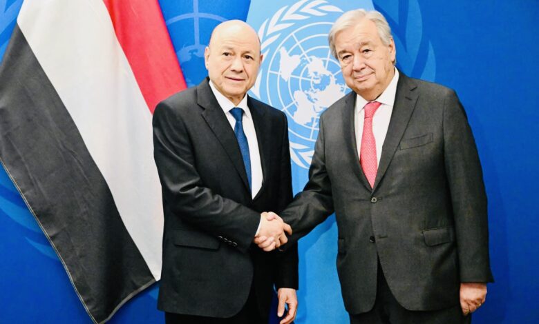 على هامش اجتماعات الجمعية العامة للأمم المتحدة الدورة 79 رئيس مجلس القيادة الرئاسي يبحث وامين عام الأمم المتحدة الوضع الانساني وجهود احلال السلام في اليمن