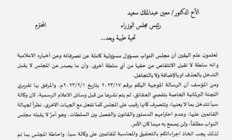واضاف : من المؤسف أن الرسالة الموجهة اليكم برقم 17/2023 بتاريخ 1/2/2023م، والمرفق بها تقريري اللجنة البرلمانية الخاصة بتقصي الحقائق، لم يتم نشرها من قبل وسائل الاعلام الرسمية، لان وكالة سبأ تتدخل بما لا يعنيها، وتتصرف كأنها رقيب على المجلس كما تفعل مع الجهات الاخرى، نظراً لجهالة القائمين عليها، وعدم احترامهم الدستور والقانون والفصل بين السلطات، وهو أمرٌ لا يقبله مجلس النواب مطلقاً، ولن يسمح به مهما كان الأمر.