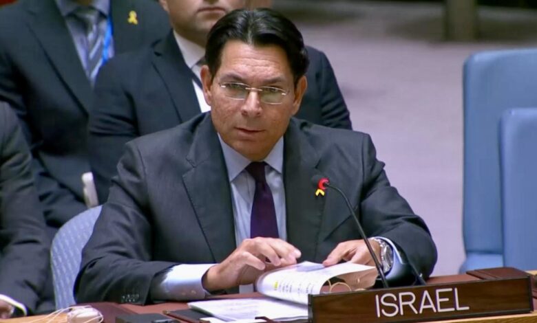 مندوب اسرائيل لدى الأمم المتحدة : مشروع القرار “ما نراه مجددا هو تمثيل مُدبر بعناية، ومصمم لعناوين الصحف، لا للسلام”.