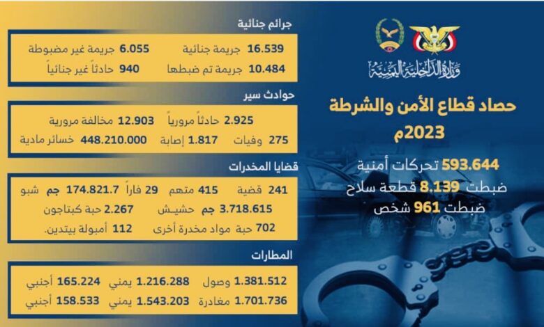 أصدر قطاع الأمن والشرطة بوزارة الداخلية، تقريراً إحصائياً حول الجرائم الجنائية والحوادث غير الجنائية والحوادث المرورية خلال العام المنصرم 2023م في المحافظات المحررة.