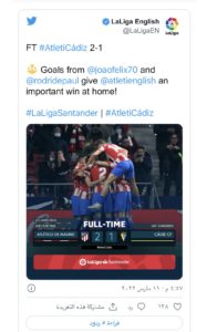 وسجل ثنائية أتلتيكو البرتغالي جواو فيليكس والأرجنتيني رودريغو دي باول في الدقيقتين 3 و68 على الترتيب، فيما سجل هدف قادش ألفارو نيغريدو في الدقيقة الـ45 من عمر اللقاء.