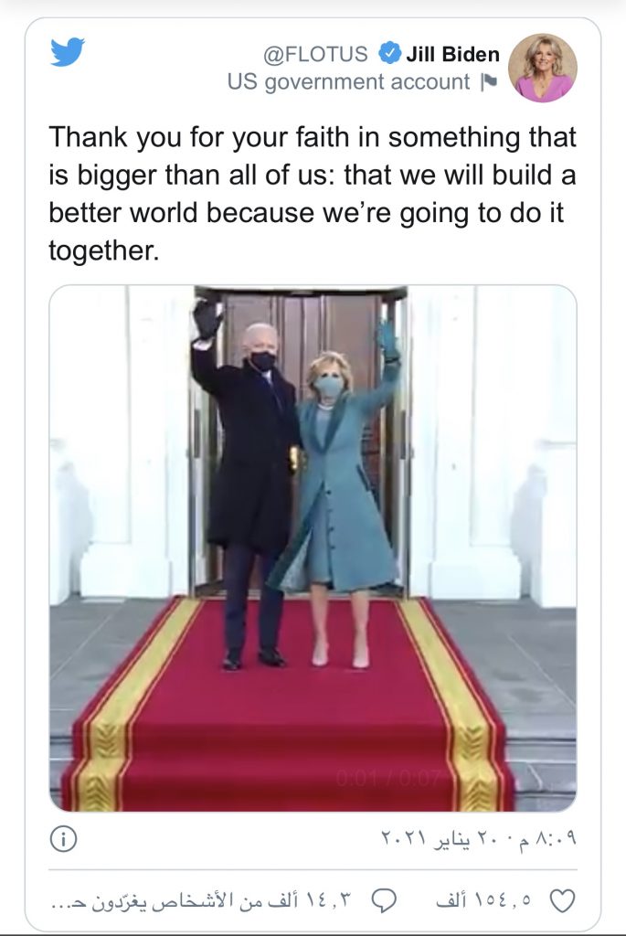 كما تضمنت تغريدة أخرى فيديو لها وللرئيس جو بايدن لدى وصولهما إلى نورث بورتيكو في البيت الأبيض، بعد حفل التنصيب الذي جرى في واشنطن مساء أمس الأربعاء، بإجراءات غير اعتيادية فرضتها جائحة كورونا والتأهب الأمني أيضا.