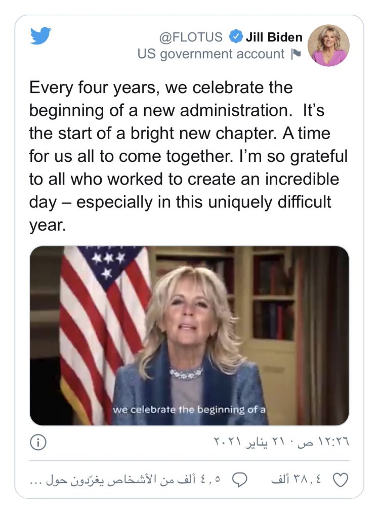 أول تغريدة لعقيلة بايدن بعد تسلم زوجها مقاليد الحكم