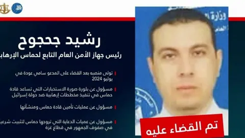 أعلن الجيش الإسرائيلي اليوم عن اغتيال رشيد جحجوح قائد جهاز الأمن العام في حماس والذي تولى منصبه بعد اغتيال سلفه سامي عودة في يوليو/تموز 2024 مع روحي مشتهى رئيس حكم حماس في قطاع غزة. وتطرق البيان الى اغتيال أيمن اصليح قائد منطقة خانيونس في جهاز الامن العام التابع لحماس.