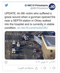 ذكرت الشرطة في مدينة فيلادلفيا الأمريكية مساء الأربعاء، أن 8 أشخاص أصيبوا بالرصاص في محطة للسكك الحديدية، في حين لا تزال الظروف المحيطة بإطلاق النار غير واضحة.