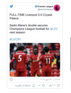 وضمن ليفربول المركز الثالث برصيد 69 نقطة بعد فوزه الثمين للمرة الأولى أمام أنصاره الذين تم تحديد عددهم بـ10 آلاف مشجع على ملعبه “الأنفيلد”، وجاء انتصار “الريدز” على حساب ضيفه كريستال بالاس بهدفين نظيفين سجلهما نجمه السنغالي ساديو ماني في الدقيقتين 36 و74.