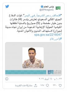وأفادت وكالة “واس”، اليوم الخميس، بأن “قوات الدفاع الجوي الملكي السعودي اعترضت ودمرت 4 طائرات بدون طيار مفخخة و5 صواريخ بالستية أطلقتها المليشيا الحوثية الإرهابية المدعومة من إيران تجاه مدينة (جيزان) لاستهداف المدنيين والأعيان المدنية”.