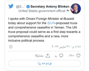 وتابع بلينكن -في تغريدة بحسابه على تويتر- “تحدثت مع نظيري العماني بدر البوسعيدي حول دعم الهدنة التي اقترحتها الأمم المتحدة ووقف إطلاق النار الشامل في اليمن”.
