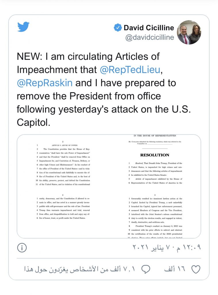 في غضون ذلك، أكد العضو الديمقراطي في مجلس النواب، ديفيد سيسيلاين، على حسابه في “تويتر”، أنه يوزع مواد عزل الرئيس التي أعدها بالتعاون مع النائبين تيد ليو وجايمي راسكين.