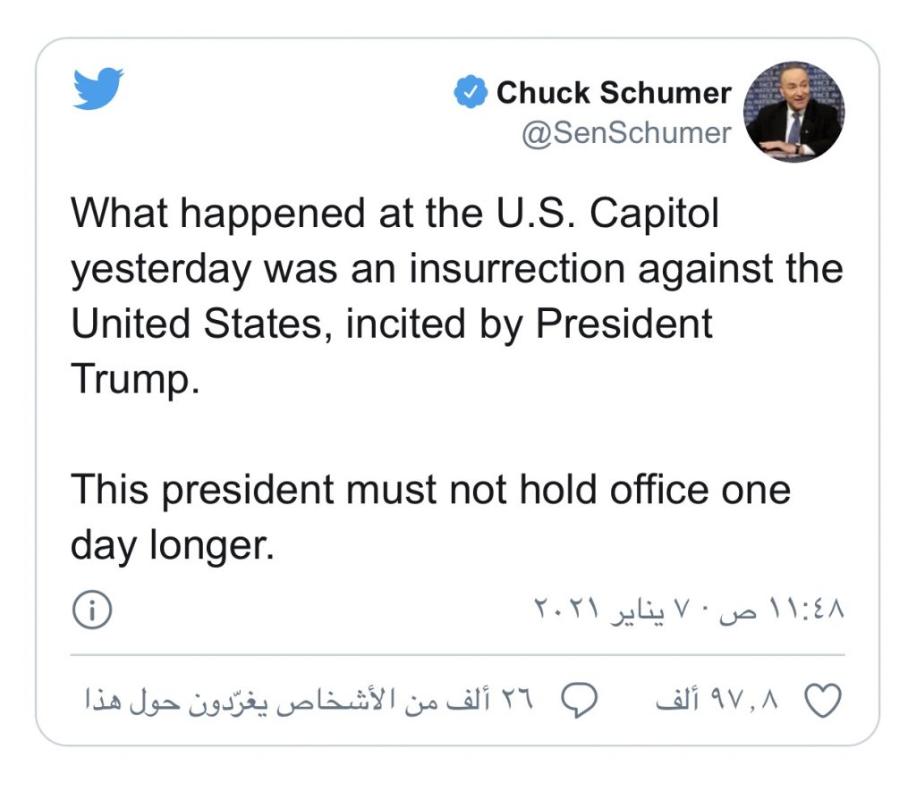 ووصف زعيم الأقلية الديمقراطية في مجلس الشيوخ، تشاك شومر، في بيان أصدره اليوم الخميس، اقتحام مقر الكونغرس على أيدي مئات من أنصار ترامب أمس بأنه “انقلاب ضد الولايات المتحدة سببه الرئيس”، مضيفا: “لا يجب أن يبقى هذا الرئيس في المنصب يوما آخر”