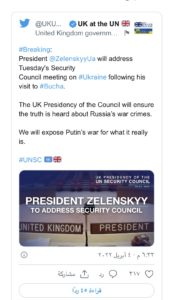 وقالت البعثة البريطانية في الأمم المتحدة في تغريدة على تويتر إن “زيلينسكي سيلقي، الثلاثاء، كلمة خلال جلسة مجلس الأمن بشأن أوكرانيا بعد زيارته إلى بوتشا”.