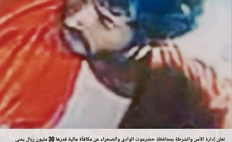 أعلنت إدارة الأمن والشرطة بمحافظة حضرموت الوادي والصحراء، اليوم، عن مكافأة مالية قدرها 30 مليون ريال يمني لمن يدلي بأي معلومات او يلقي القبض على المتهم المبين في الصورة المرفقة كونه مطلوب أمني في قضية مقتل المغدور به رجل المرور مساعد أول / دوار علي صالح عزيز.