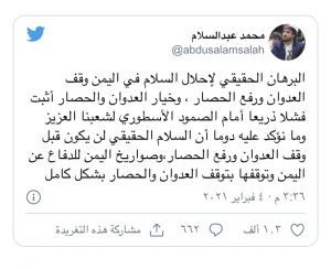 وكتب في تغريدة: “البرهان الحقيقي لإحلال السلام في اليمن هو وقف العدوان ورفع الحصار، وخيار العدوان والحصار أثبت فشلا ذريعا أمام الصمود الأسطوري لشعبنا العزيز”.
