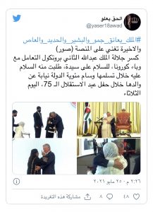 كسر الملك الأردني عبدالله الثاني بروتوكول التعامل مع وباء كورونا، للسلام على سيدة طلبت منه السلام عليه خلال تسلمها وسام مئوية الدولة نيابة عن والدها خلال حفل عيد الاستقلال الـ75.