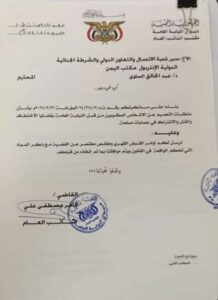 لافتاً الى موافاة الشعبة بأوامر القبض القهري وملخص مختصر عن القضية مع ذكر المواد التي تحكم الواقعة في القانون ، وطلب النائب العام من مدير شعبة “الإنتربول” بمكتب اليمن بموافاته لاحقاً بما تم اتخاذه من قبل الشعبة.
