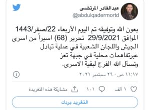 وقال رئيس اللجنة عبد القادر المرتضى في منشور له على “تويتر”، إن عملية تبادل الأسرى حررت 68 أسيرا من أسرى “الجيش واللجان الشعبية” في عملية تبادل عبر تفاهمات محلية في جبهة تعز.