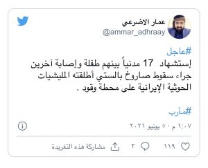 وأصاب الصاروخ محطة وقود في حي الروضة بمأرب، بحسب علي الغليسي السكرتير الصحفي لمحافظ مأرب، مشيرا إلى أن عشرات الأشخاص أصيبوا في الهجوم.
