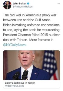 قال مستشار الأمن القومي الأمريكي السابق جون بولتن الحرب باليمن هو حرب وكالة بين إيران ودول الخليج العربي وبايدن يتنازل لإيران . وكتب تغريدة على تويتر