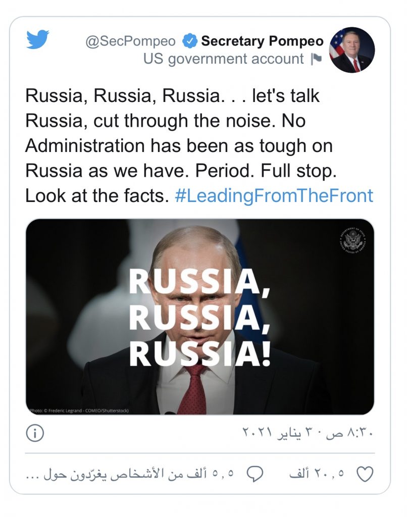 نشر وزير الخارجية الأمريكي مايك بومبيو مساء يوم الأحد تغريدة على “تويتر” تحدث فيها على روسيا، وما أنجزته الإدارة الأمريكية في عهد ترامب.