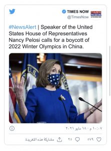 دعت الرئيسة الديمقراطية لمجلس النواب الأمريكي، نانسي بيلوسي، الثلاثاء، إلى “مقاطعة دبلوماسية” للألعاب الأولمبية الشتوية 2022 في بكين، بهدف التنديد بانتهاكات حقوق الإنسان في الصين.