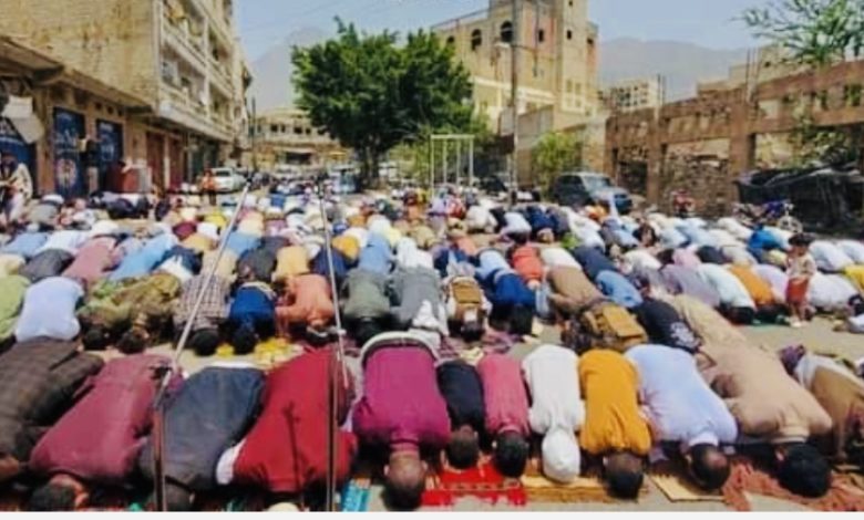 تعز.. المئات يؤدون صلاة الجمعة في المنفذ الشرقي للمطالبة بإنهاء الحصار الحوثي على المدينة