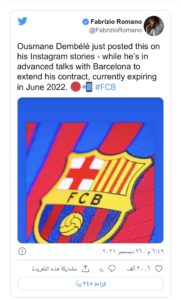 وكتب الصحفي الإيطالي فابريزيو رومانو، خبير انتقالات اللاعبين والمدربين في أوروبا، على حسابه في “تويتر”: “نشر ديمبلي هذه الصورة، لأنه يجري مفاوضات متقدمة مع برشلونة لتمديد عقده”.