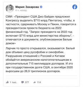 وكتبت زاخاروفا على “فيسبوك”: “تدمير العلاقات مع روسيا والصين سيكلف دافعي الضرائب الأمريكيين 715 مليار دولار إضافية، وهذا إضافة إلى ديون الحكومة الأمريكية التي ارتفعت في سبتمبر 2020 إلى 26.9 تريليون دولار”.