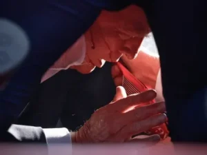 وأظهرت اللقطات ترامب وهو ينحني والدماء تنزف من وجهه، وسرعان ما اجتاحه عملاء الخدمة السرية وسحبوه إلى سيارة، وبدا أن ترامب يرفع قبضته أثناء إخراجه من المسرح.