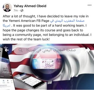 عبيد يعلن انسحابه من الصفحة المغترب اليمني بعد انحرافها عن المسار الصحيح تجاة ابنا الجالية بشكل عام