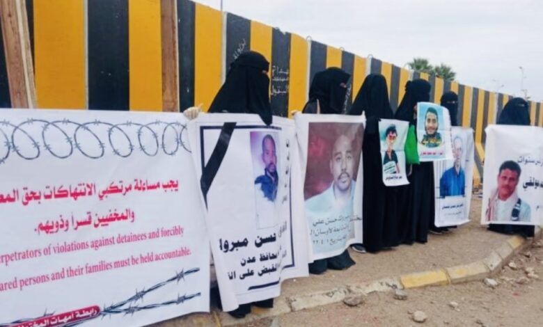 وفي الوقفة الاحتجاجية، طالبت “رابطةُ أُمهات المختطفين” بعدن لدى الانتقالي الاحتلال بالكشف عن مصير 61 مخفياً، وإطلاق سراح 37 آخرين، يعانون أسوأَ الأوضاع الإنسانية في سجون الانتقالي السرية سيئة السُّمعة والصيت.