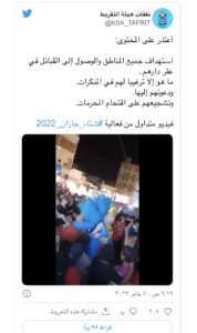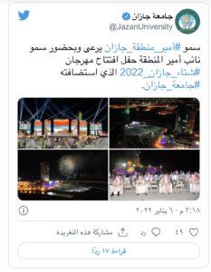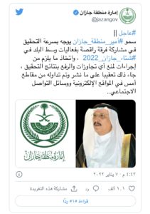 وقال حساب الإمارة على موقع التواصل الاجتماعي “تويتر” أمس الجمعة: “سمو أمير منطقة جازان يوجه بسرعة التحقيق في مشاركة فرقة راقصة بفعاليات وسط البلد في شتاء جازان 2022، واتخاذ ما يلزم من إجراءات لمنع أي تجاوزات، والرفع بنتائج التحقيق”.