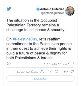وقال غوتيريش، في تغريدة نشرها اليوم الأحد: “تظل الأوضاع في الأراضي الفلسطينية المحتلة تحديا يواجهه السلام والأمن الدوليين”.