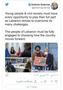 وقال غوتيريش في تغريدة على موقع “تويتر”، أنه “يجب أن تتاح للشباب والمجتمع المدني كل الفرص للعب دورهم الكامل بينما يسعى لبنان للتغلب على تحدياته العديدة”. وأضاف “يجب أن يشارك الشعب اللبناني بشكل كامل في اختيار كيفية تقدم البلد”.