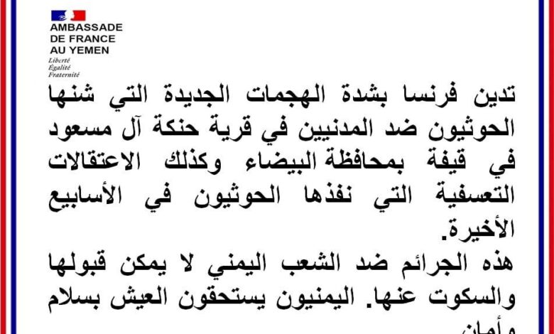فرنسا تدين بشدة الهجمات الجديدة التي شنها الحوثيون ضد المدنيين في قرية حنكة آل مسعود في قيفة بمحافظة البيضاء