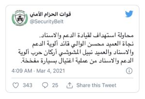 وقال التوجيه المعنوي التابع للانتقالي، في تغريدة على “تويتر”، إنّ العميد محسن الوالي قائد ألوية الدعم والإسناد، ونبيل المشوشي رئيس أركان حرب ألوية الدعم والإسناد، نجوَا من عملية اغتيال بسيارة مفخخة