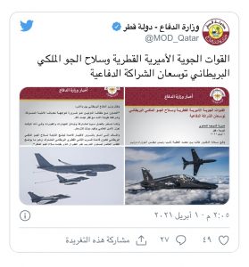 وتتضمن المذكرة، حسبما نقلته وزارة الدفاع القطرية، تدريبا مشتركا بين القوات الجوية الأميرية القطرية وسلاح الجو الملكي البريطاني على سرب طائرات “Hawk” بالإضافة إلى توظيف طائرة “Voyager” لتزويد طائرات القوات القطرية بالوقود جوا.