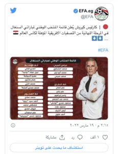 أعلن مدرب منتخب مصر، كارلوس كيروش، قائمة “الفراعنة” لخوض مواجهتي السنغال ضمن تصفيات إفريقيا المؤهلة لمونديال “قطر 2022″، وسط حالة من القلق حيال تجدد إصابة نجم ليفربول، محمد صلاح.