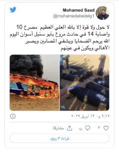 وأفاد الرئيس المصري عبد الفتاح السيسي بأنه يتابع عن كثب حادث تصادم الأوتوبيس السياحي بسيارة نقل بمحافظة أسوان، وأكد أنه وجه الأجهزة المعنية بإتخاذ كافة الإجراءات اللازمة والمتابعة المستمرة وتوفير كافة أوجة الرعاية الطبية والعلاجية لمصابي الحادث الأليم.