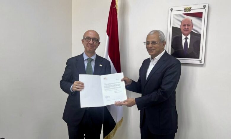 تسلم نائب وزير الخارجية وشؤون المغتربين، مصطفى نعمان، اليوم، في العاصمة المؤقتة عدن، اوراق اعتماد الممثل الجديد لصندوق الأمم المتحدة للسكان (UNFPA)، فرانشيسكو غالييتيري، وذلك في إطار تعزيز مجالات التعاون والشراكة بين الحكومة اليمنية ووكالات ومنظمات الأمم المتحدة.