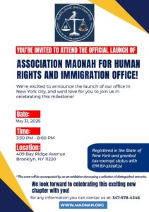 The Association Ma’onah for Human Rights and Immigration (AMHRI) is pleased to invite you to attend the grand opening ceremony of its official office in New York City — a new step towards expanding its activities and services in the defense of human rights.