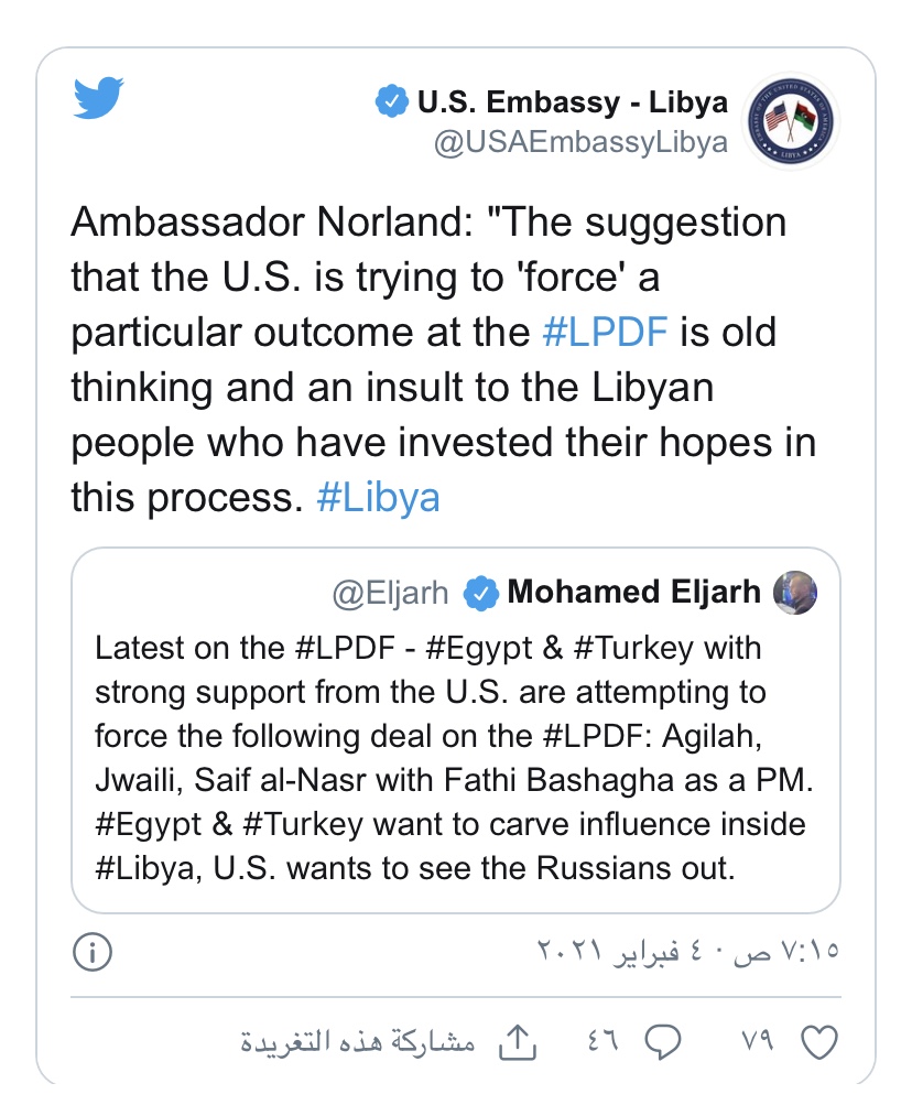 وجاء ذلك تعليقا على تغريدة أخرى نشرها الباحث السياسي الليبي محمد الجارح حيث كتب أن مصر وتركيا بدعم قوي من الولايات المتحدة تحاول فرض اتفاقا على ملتقى الحوار الليبي يقضي بتشكيل حكومة جديدة برئاسة وزير الداخلية في حكومة الوفاق فتحي باشاغا الذي أعلن مؤخرا عن ترشحه لمنصب رئيس الوزراء.