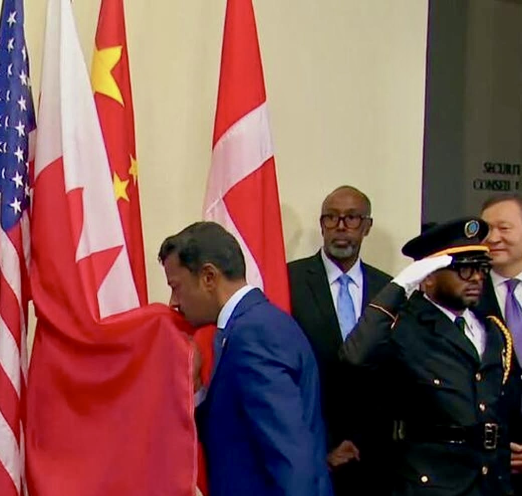 في المقر الدائم للأمم المتحدة وخارج قاعة مجلس الأمن الدولي رُفعت أعلام الدول الخمس التي بدأت عضويتها في المجلس في الأول من كانون الثاني/يناير لمدة عامين، ومنها مملكة البحرين.
