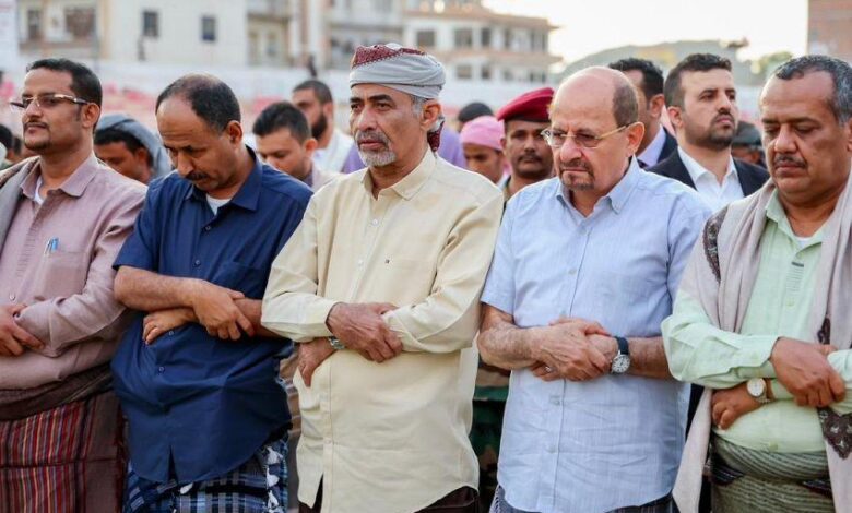 وفي عدن أيضاً، أدّى وزير الدفاع طاهر العقيلي والداخلية إبراهيم حيدان والخدمة المدنية بدر باسلمة ووزراء آخرين صلاة عيد الفطر المبارك مع عدد من وزراء الحكومة والمسؤولين والقادة العسكريين في قصر معاشيق. وعقب الصلاة تبادل وزير الدفاع التهاني والتبريكات مع الحاضرين، سائلاً الله أن يعيد المناسبة “وقد تحقق لبلادنا الأمن والاستقرار والتنمية والازدهار”، كما هنأ منتسبي القوات المسلحة المرابطين في مختلف مواقع وجبهات القتال، مؤكداً أن “ثباتهم وبطولاتهم ستثمر نصراً مؤزراً”.