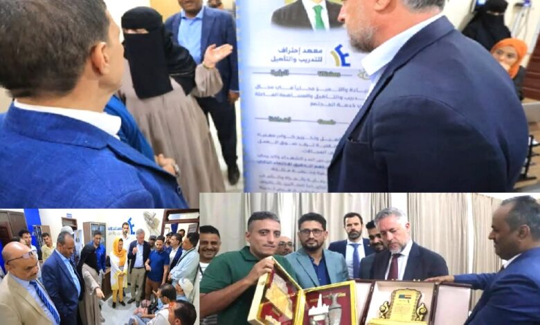 خلال زيارته معهد احتراف.. مؤسسة الشيخ حمود المخلافي تكرم سفير الاتحاد الأوروبي تقديراً لجهوده الإنسانية والتنموية