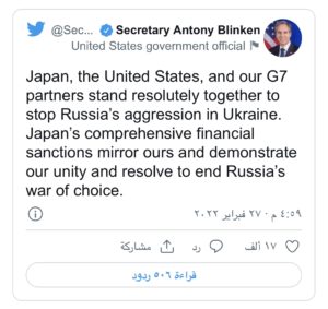 بلينكن: طوكيو وواشنطن وشركاؤنا في مجموعة السبع يقفون بحزم لمنع الهجوم الروسي