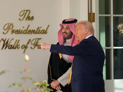 ولي العهد السعودي الأمير محمد بن سلمان برفقة الرئيس الأميركي دونالد ترمب في جولة في أرجاء البيت الأبيض في العاصمة…