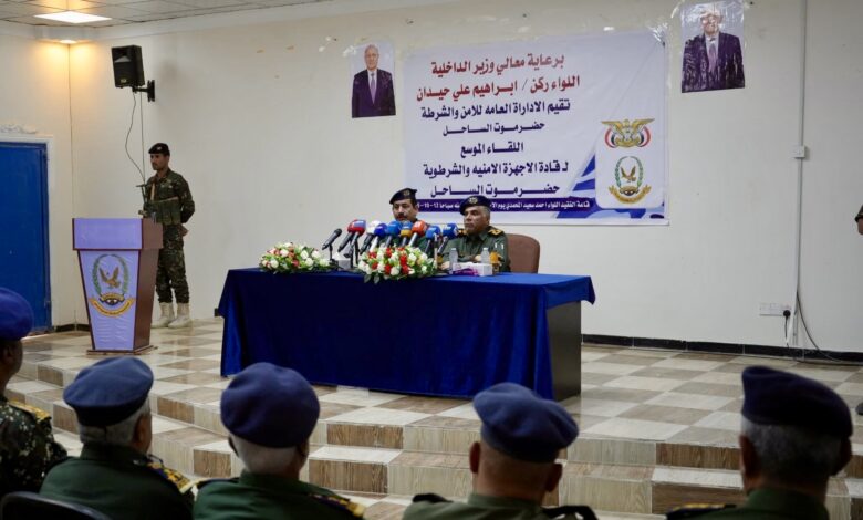 وفي سياق متصل، ترأّس وزير الداخلية اللواء الركن إبراهيم علي حيدان، اليوم، لقاءاً أمنياً موسّعاً بقيادات شرطة ساحل حضرموت.